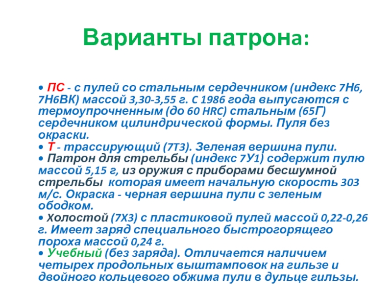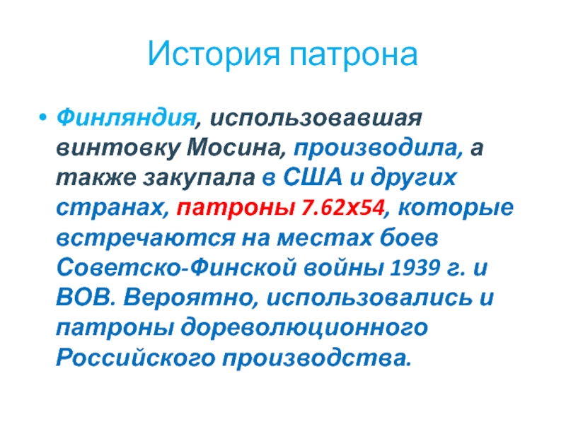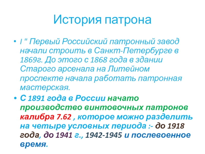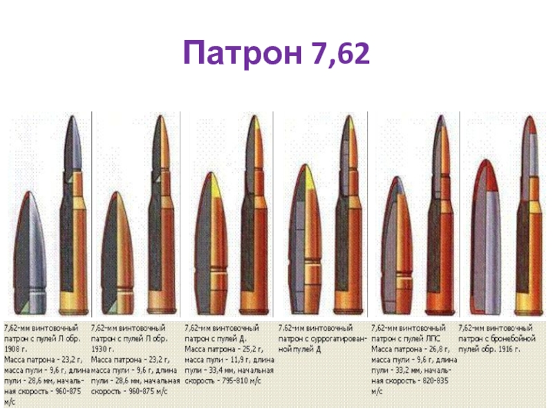 С 1891 года в России начато производство винтовочных патронов калибра 7.62 , которое можно разделить на четыре условных периода :- до 1918 года, до 1941 г., 1942-1945 и послевоенное время.