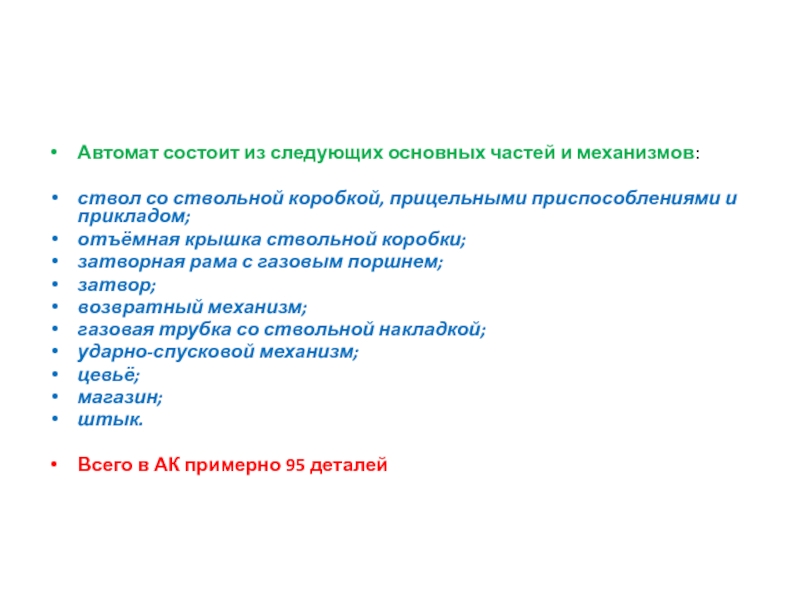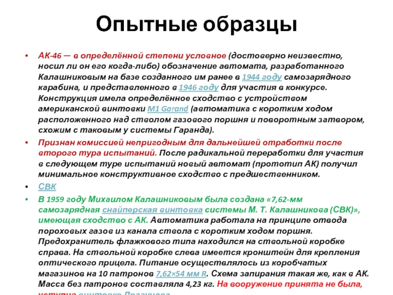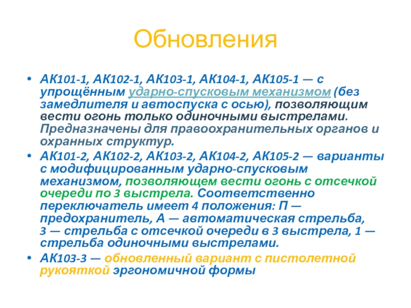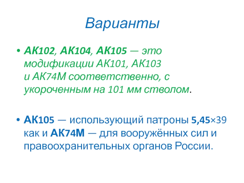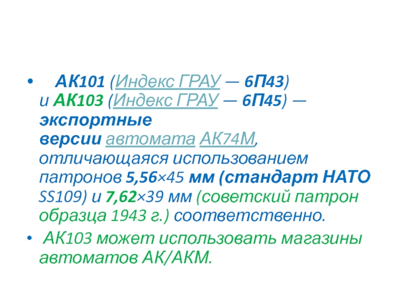 Слайд 45 АК101 (Индекс ГРАУ — 6П43) и АК103 (Индекс ГРАУ — 6П45) — экспортные версии автомата АК74М, отличающаяся использованием патронов