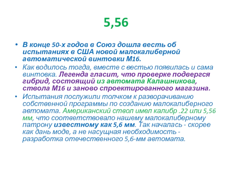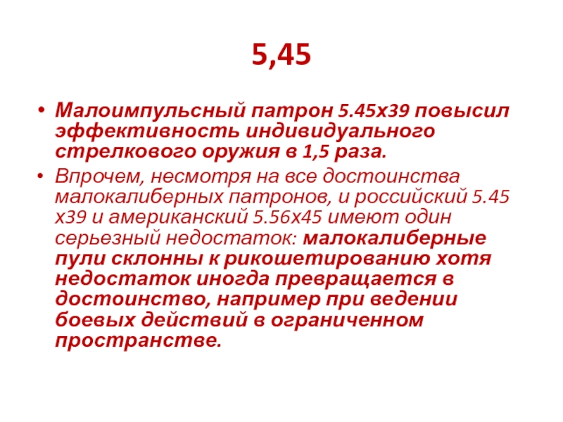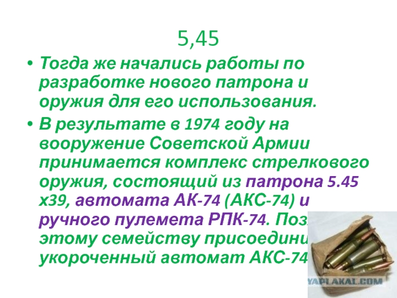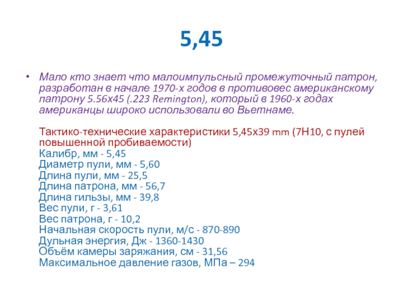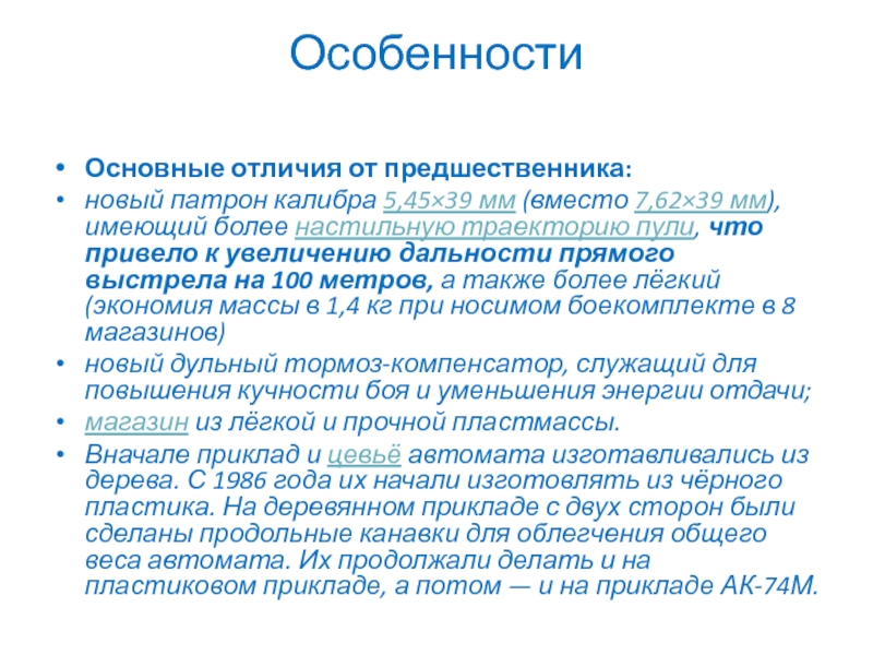новый патрон калибра 5,45×39 мм (вместо 7,62×39 мм), имеющий более настильную траекторию
