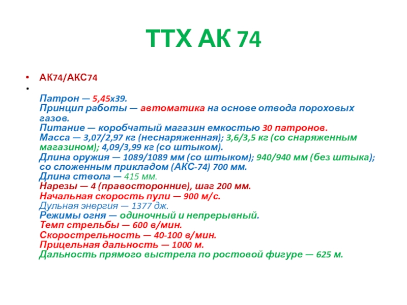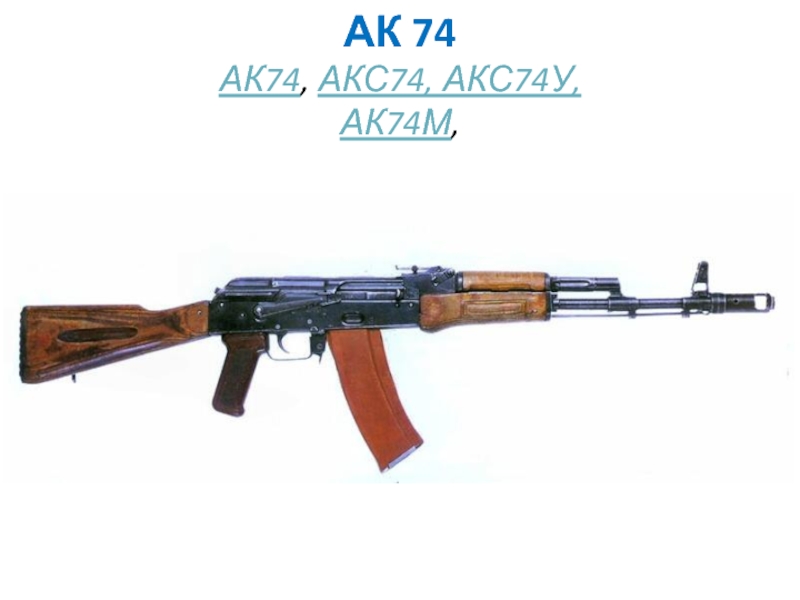 Является дальнейшим развитием АКМ. Разработка АК74 связана с переходом на новый малоимпульсный патрон 5,45×39 мм.