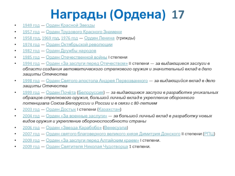 1994 год — Орден «За заслуги перед Отечеством» II степени — за выдающиеся заслуги в области создания автоматического стрелкового оружия и значительный вклад в дело защиты Отечества