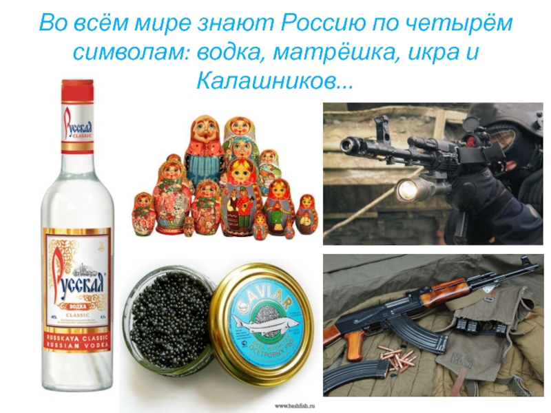 Слайд 9Во всём мире знают Россию по четырём символам: водка, матрёшка, икра