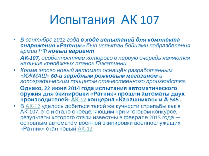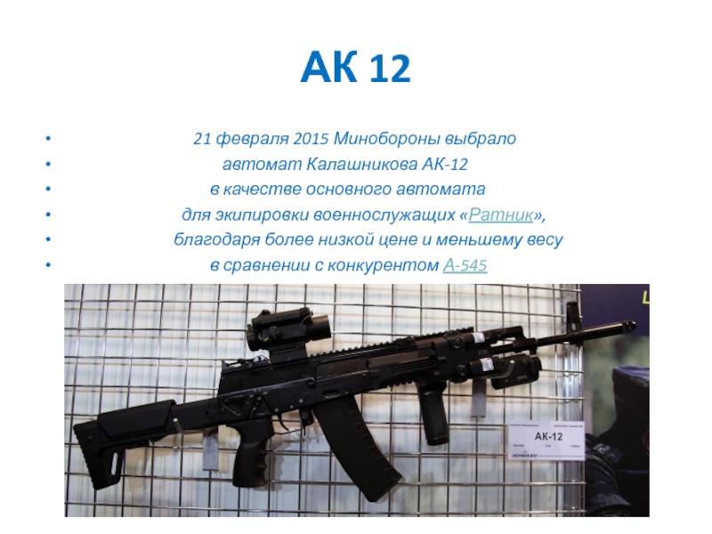 Однако, 22 июня 2014 года испытания автоматического оружия для экипировки «Ратник» прошли автоматы двух производителей: АК-12 концерна «Калашников» и А-545 .