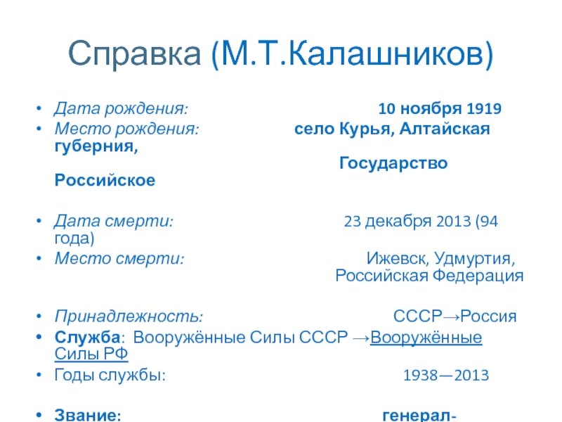 2013 год — на родине в селе Курья Алтайского края открыт мемориальный музей М. Т. Калашникова.