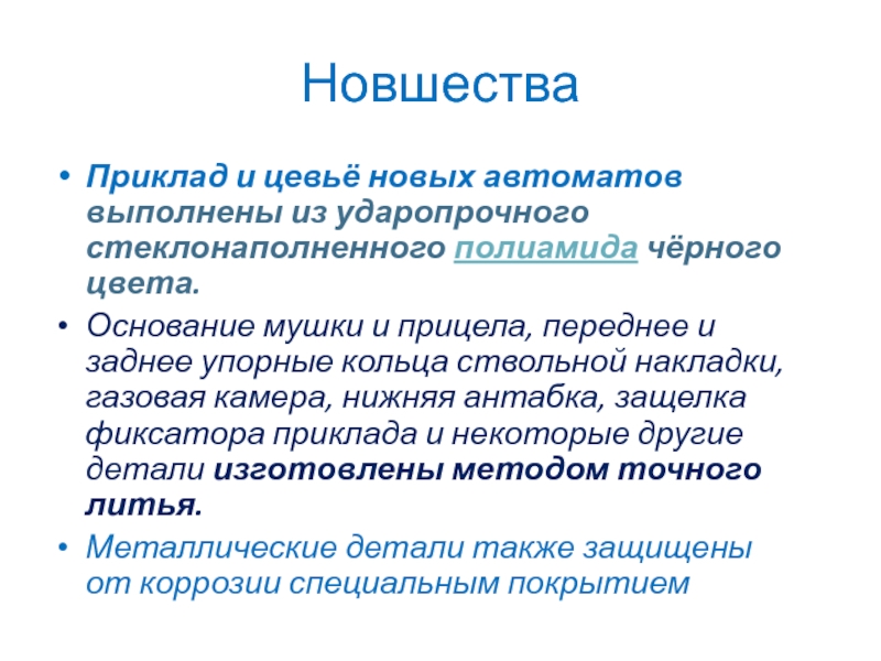 прицела, переднее и заднее упорные кольца ствольной накладки, газовая камера, нижняя антабка, защелка фиксатора приклада и некоторые другие детали изготовлены методом точного литья.