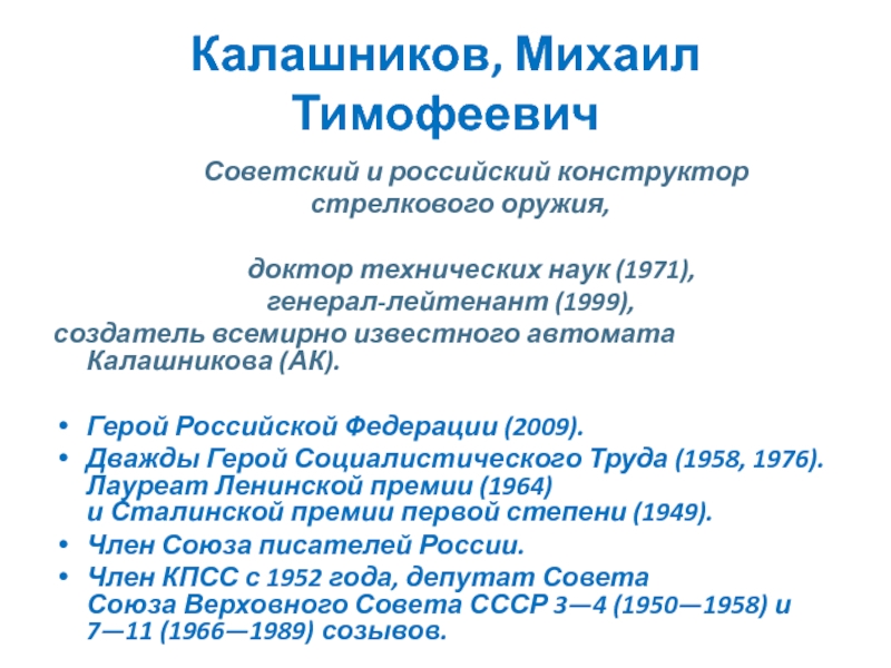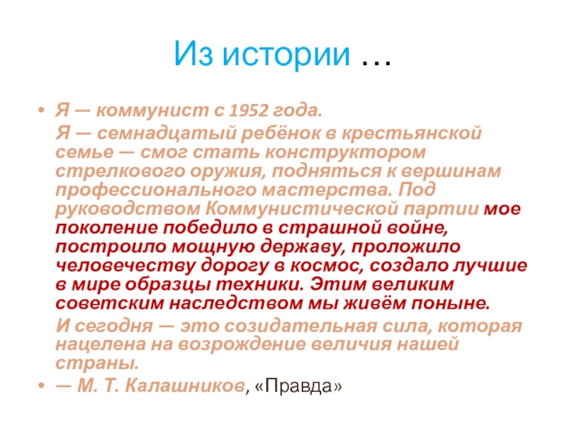семнадцатый ребёнок в крестьянской семье — смог стать конструктором стрелкового оружия, подняться к вершинам профессионального мастерства. Под руководством Коммунистической партии мое поколение победило в страшной войне, построило мощную державу, проложило человечеству дорогу в космос, создало лучшие в мире образцы техники. Этим великим советским наследством мы живём поныне.