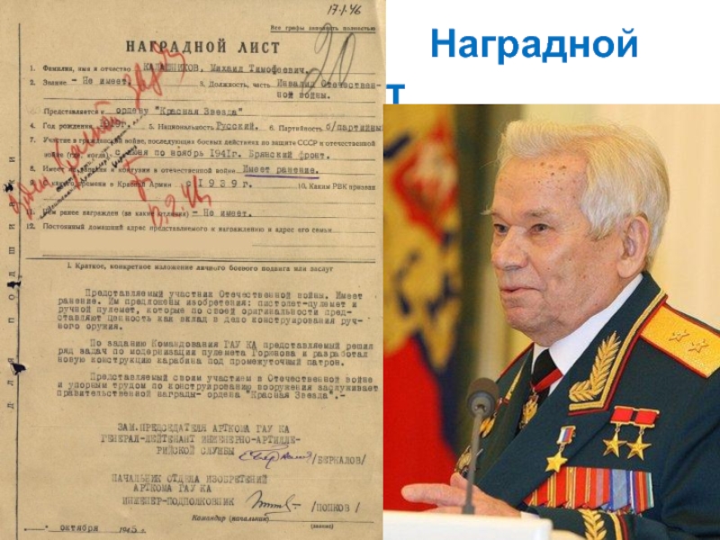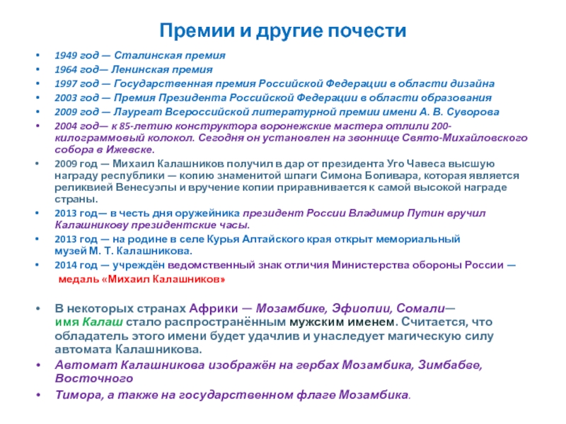 2013 год— в честь дня оружейника президент России Владимир Путин вручил Калашникову президентские часы.
