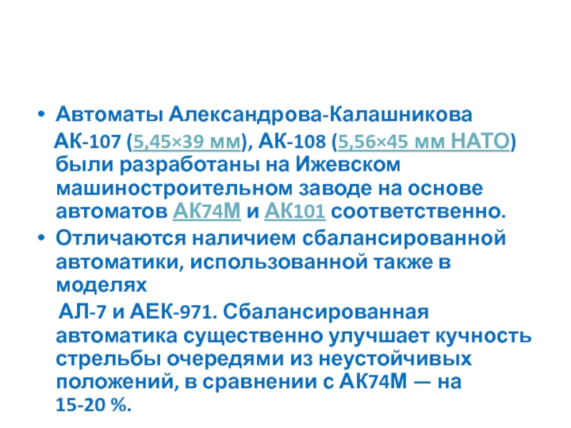 АЛ-7 и АЕК-971. Сбалансированная автоматика существенно улучшает кучность стрельбы очередями из неустойчивых положений, в сравнении с АК74М — на 15-20 %.