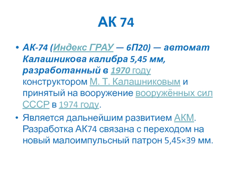 АК-74 (Индекс ГРАУ — 6П20) — автомат Калашникова калибра 5,45 мм, разработанный в 1970 году конструктором М. Т. Калашниковым и