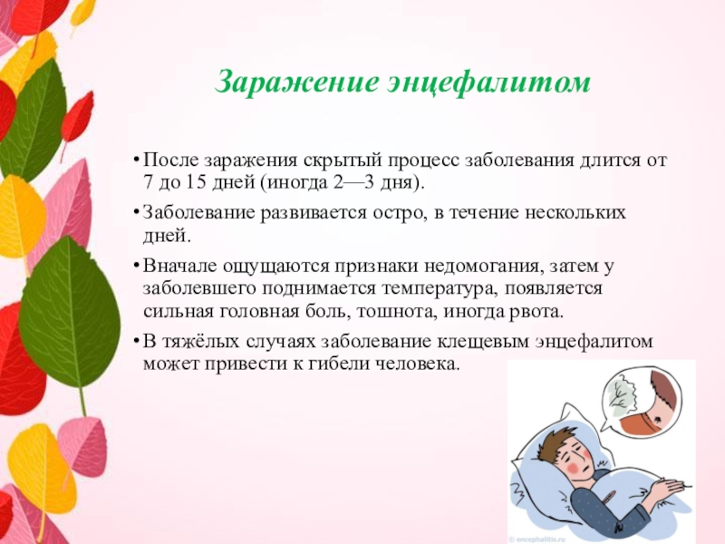 Слайд 8Тяжесть поражения клещевым энцефалитом зависит от общего состояния человека перед заболеванием,