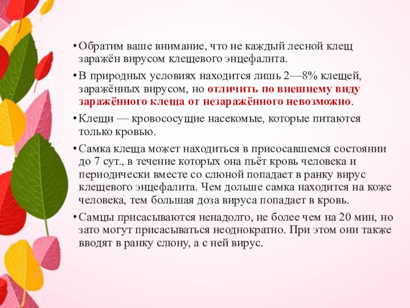 Слайд 9Обратим ваше внимание, что не каждый лесной клещ заражён вирусом клещевого
