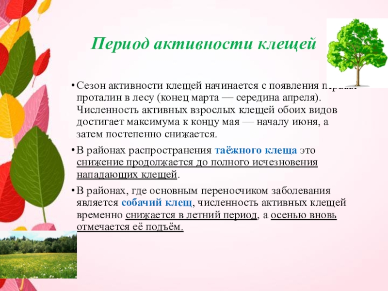 лесу (конец марта — середина апреля). Численность активных взрослых клещей обоих видов достигает максимума к концу мая — началу июня, а затем постепенно снижается.