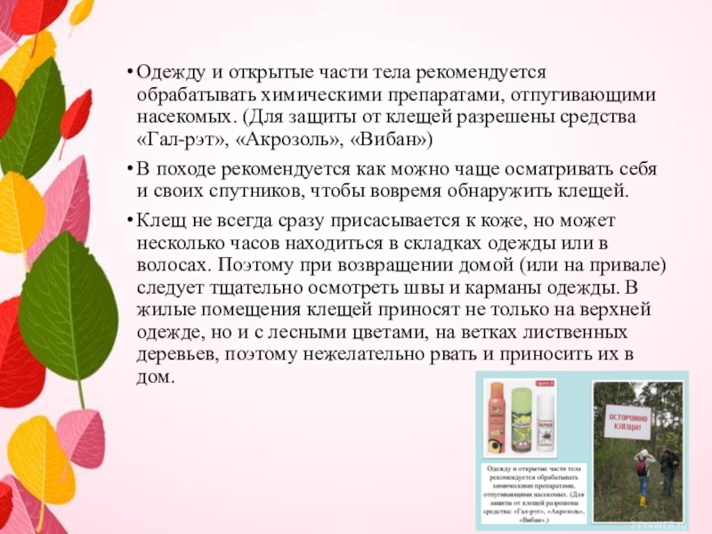 Слайд 10Одежду и открытые части тела рекомендуется обрабатывать химическими препаратами, отпугивающими насекомых.