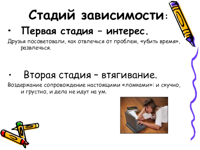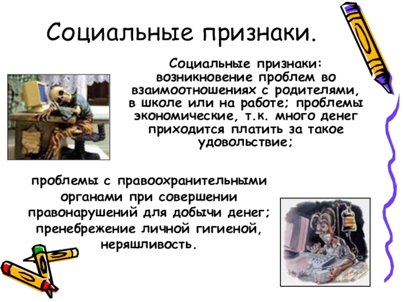 проблемы с правоохранительными органами при совершении правонарушений для добычи денег; пренебрежение личной гигиеной, неряшливость.