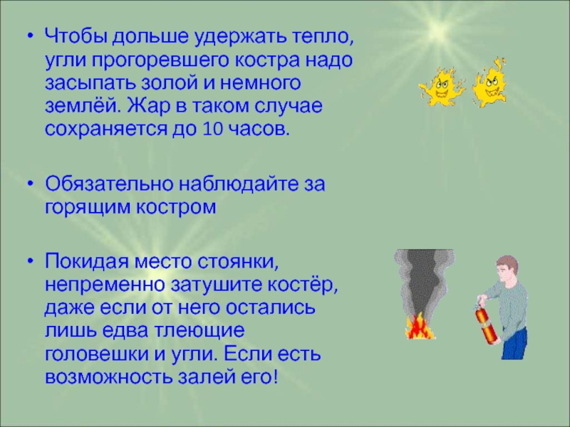 Слайд 44Чтобы дольше удержать тепло, угли прогоревшего костра надо засыпать золой и