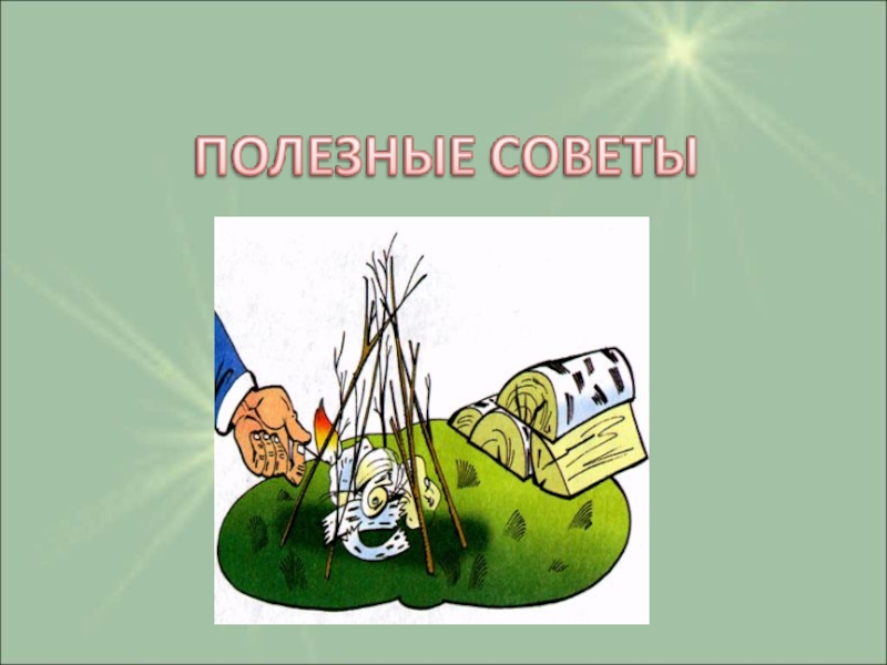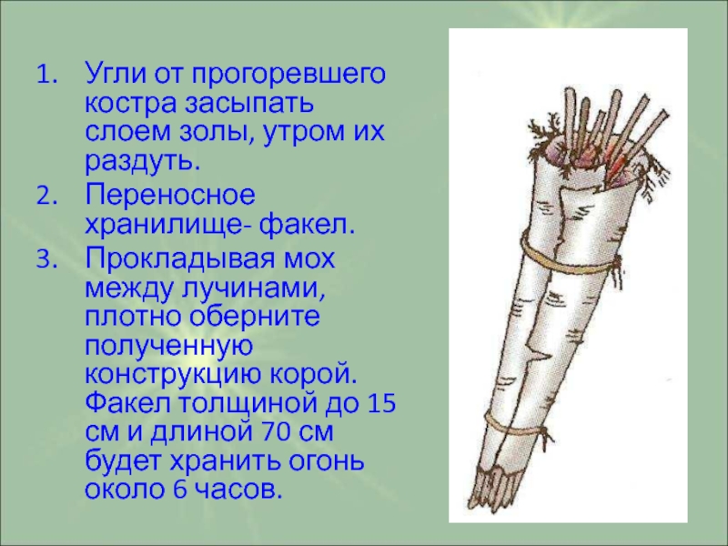 Слайд 42Угли от прогоревшего костра засыпать слоем золы, утром их раздуть.