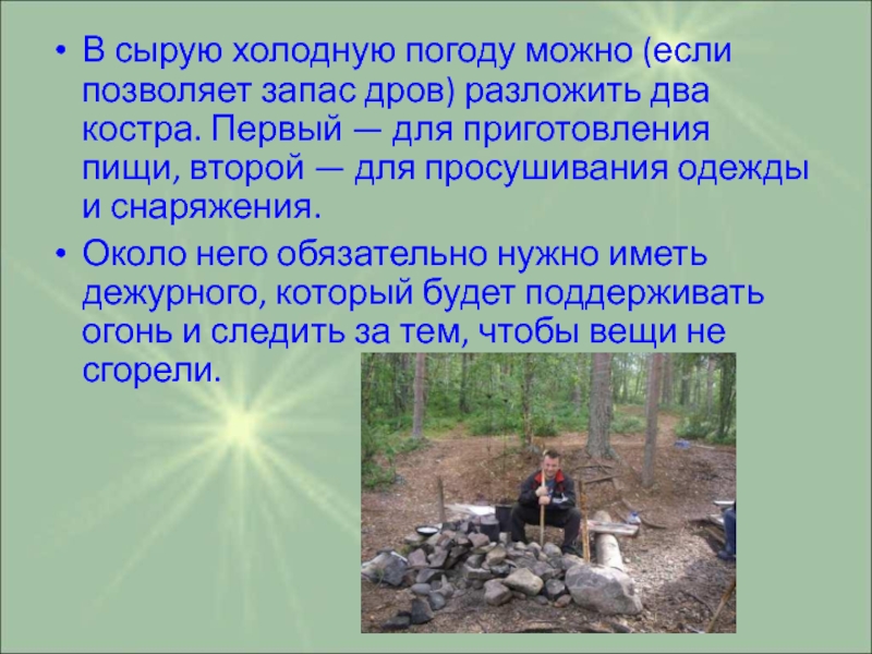Слайд 29В сырую холодную погоду можно (если позволяет запас дров) разложить два