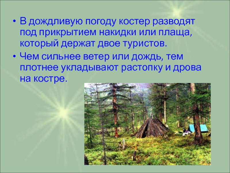 Слайд 28В дождливую погоду костер разводят под прикрытием накидки или плаща, который