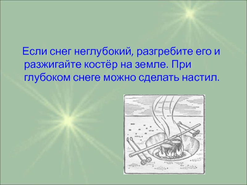 Слайд 6 Если снег неглубокий, разгребите его и разжигайте костёр на