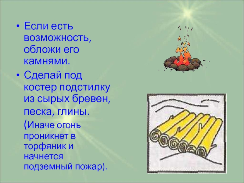 сырых бревен, песка, глины. (Иначе огонь проникнет в торфяник и начнется подземный пожар).