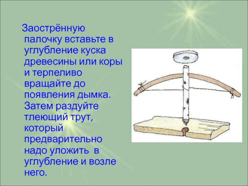 и терпеливо вращайте до появления дымка. Затем раздуйте тлеющий трут, который предварительно надо уложить в углубление и возле него.
