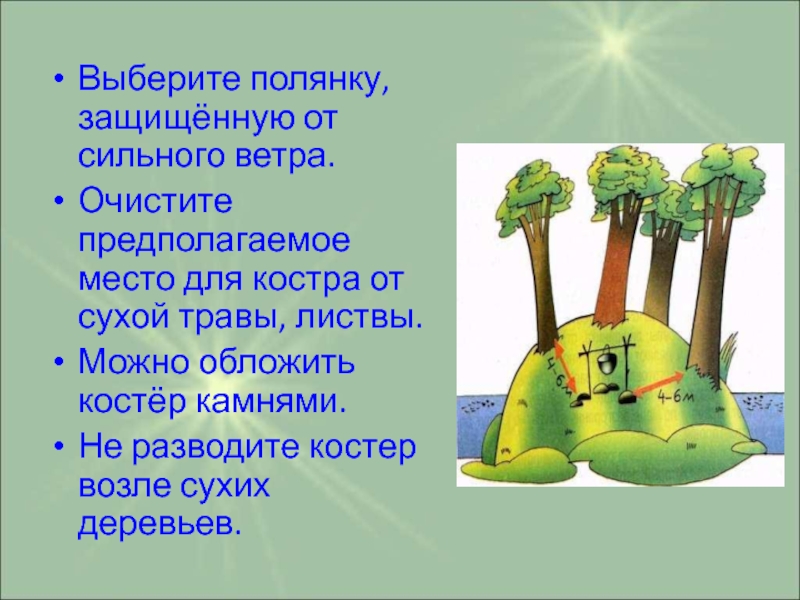 Убери листву, хвою, траву вокруг костра на 1 — 1,5 м.
