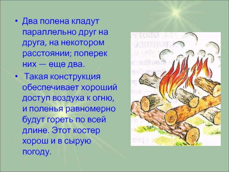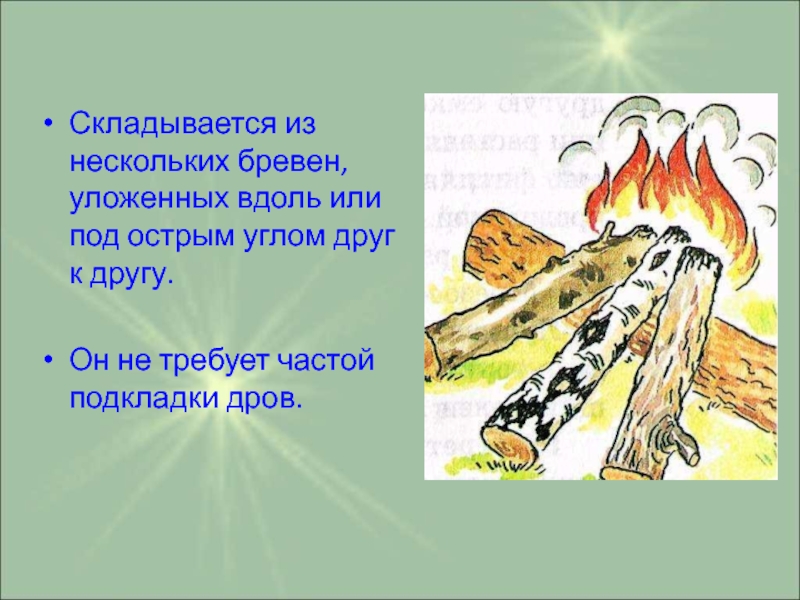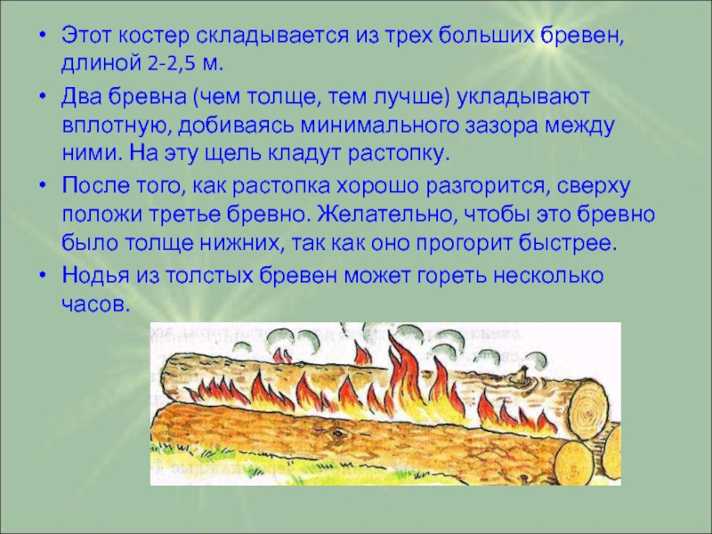 Слайд 40Этот костер складывается из трех больших бревен, длиной 2-2,5 м.