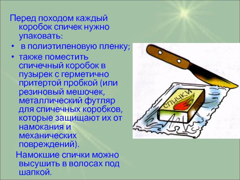 Слайд 19Перед походом каждый коробок спичек нужно упаковать: