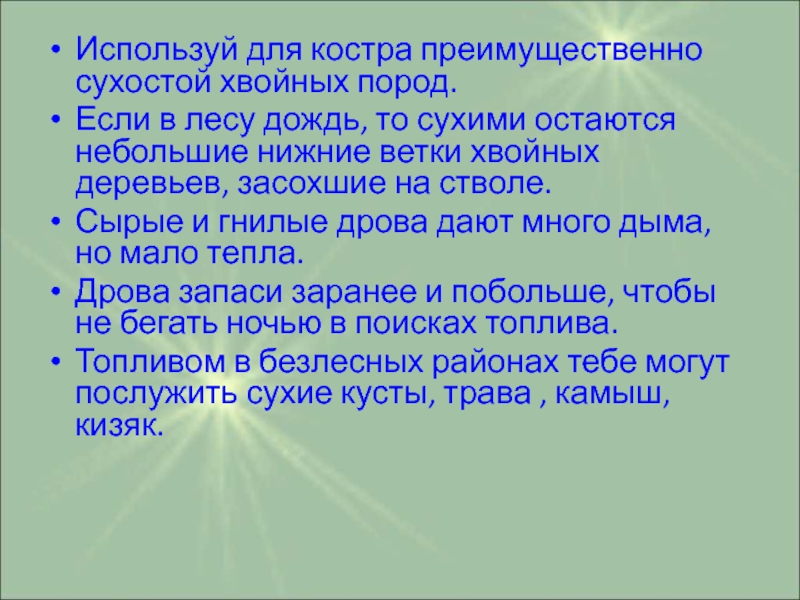 Слайд 16Используй для костра преимущественно сухостой хвойных пород.