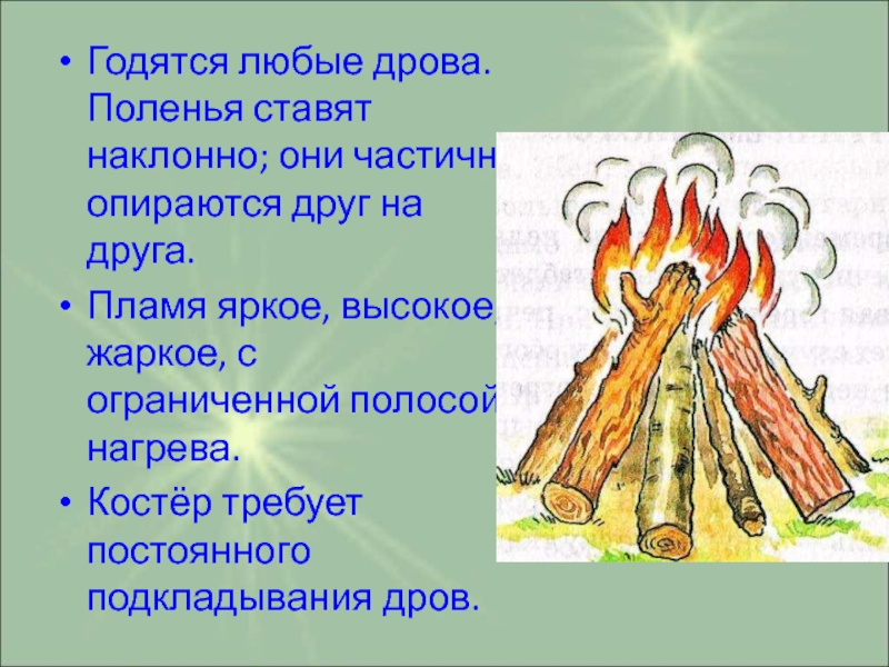 Слайд 32Годятся любые дрова. Поленья ставят наклонно; они частично опираются друг на
