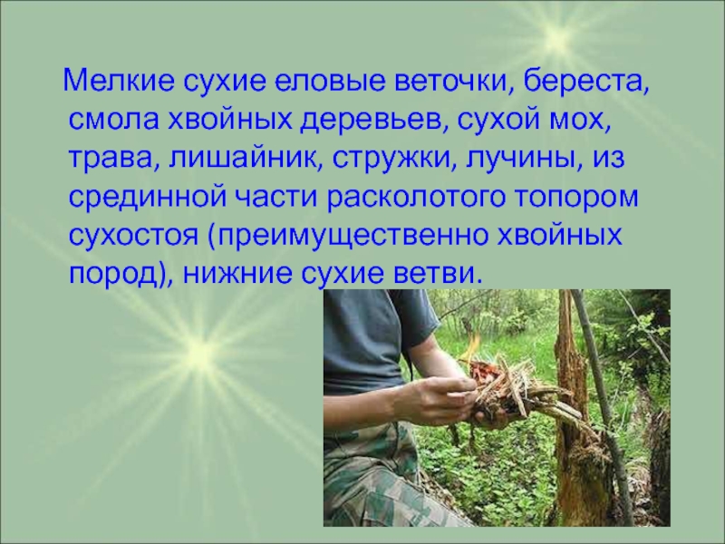 Слайд 13 Мелкие сухие еловые веточки, береста, смола хвойных деревьев, сухой