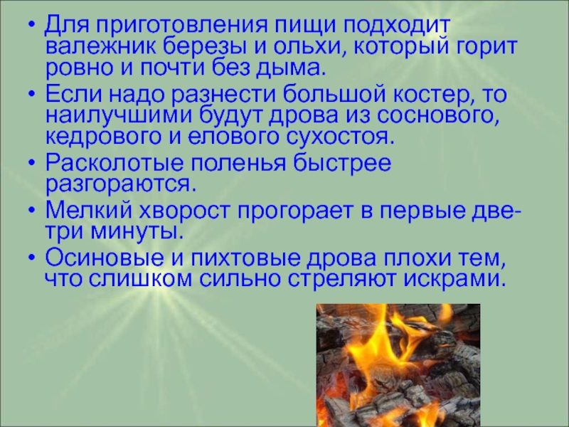 Слайд 14Для приготовления пищи подходит валежник березы и ольхи, который горит ровно
