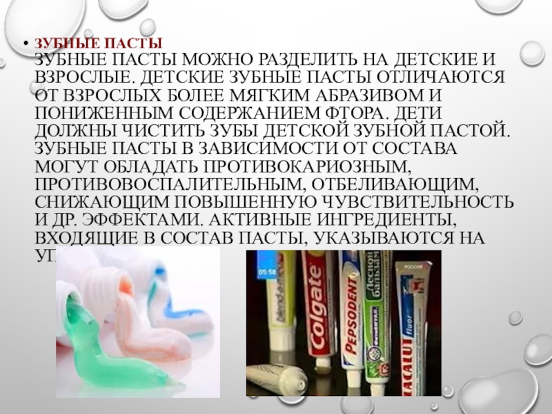 ЗУБНЫЕ ПАСТЫ МОЖНО РАЗДЕЛИТЬ НА ДЕТСКИЕ И ВЗРОСЛЫЕ. ДЕТСКИЕ ЗУБНЫЕ