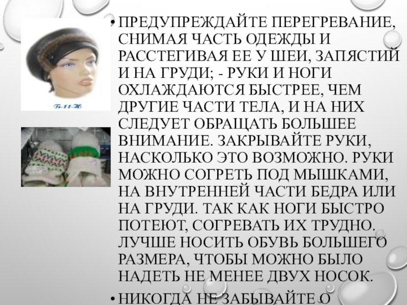 И НА ГРУДИ; - РУКИ И НОГИ ОХЛАЖДАЮТСЯ БЫСТРЕЕ, ЧЕМ ДРУГИЕ ЧАСТИ ТЕЛА, И НА НИХ СЛЕДУЕТ ОБРАЩАТЬ БОЛЬШЕЕ ВНИМАНИЕ. ЗАКРЫВАЙТЕ РУКИ, НАСКОЛЬКО ЭТО ВОЗМОЖНО. РУКИ МОЖНО СОГРЕТЬ ПОД МЫШКАМИ, НА ВНУТРЕННЕЙ ЧАСТИ БЕДРА ИЛИ НА ГРУДИ. ТАК КАК НОГИ БЫСТРО ПОТЕЮТ, СОГРЕВАТЬ ИХ ТРУДНО. ЛУЧШЕ НОСИТЬ ОБУВЬ БОЛЬШЕГО РАЗМЕРА, ЧТОБЫ МОЖНО БЫЛО НАДЕТЬ НЕ МЕНЕЕ ДВУХ НОСОК.
