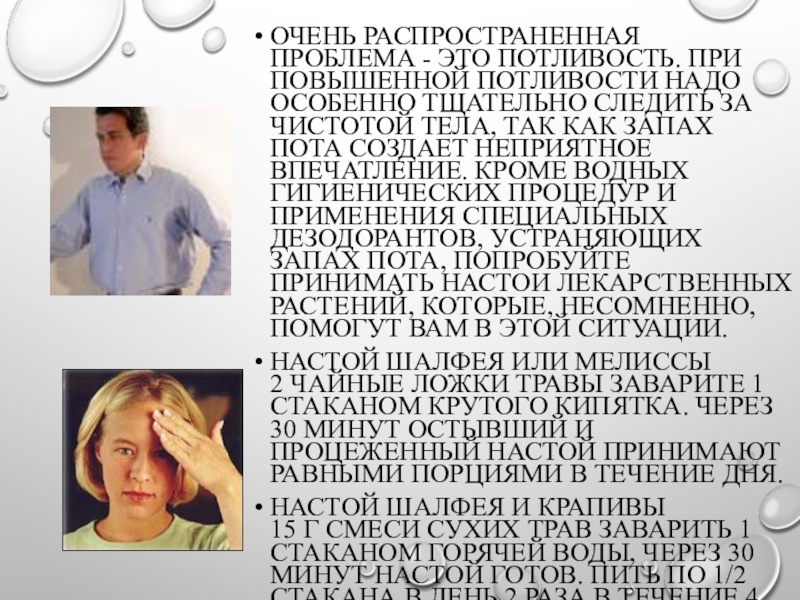 ТЩАТЕЛЬНО СЛЕДИТЬ ЗА ЧИСТОТОЙ ТЕЛА, ТАК КАК ЗАПАХ ПОТА СОЗДАЕТ НЕПРИЯТНОЕ ВПЕЧАТЛЕНИЕ. КРОМЕ ВОДНЫХ ГИГИЕНИЧЕСКИХ ПРОЦЕДУР И ПРИМЕНЕНИЯ СПЕЦИАЛЬНЫХ ДЕЗОДОРАНТОВ, УСТРАНЯЮЩИХ ЗАПАХ ПОТА, ПОПРОБУЙТЕ ПРИНИМАТЬ НАСТОИ ЛЕКАРСТВЕННЫХ РАСТЕНИЙ, КОТОРЫЕ, НЕСОМНЕННО, ПОМОГУТ ВАМ В ЭТОЙ СИТУАЦИИ.
