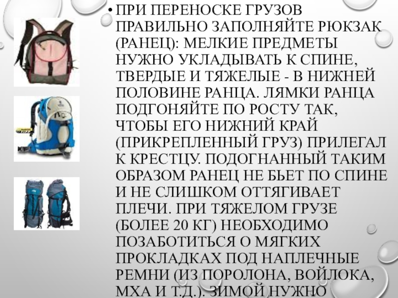 Слайд 19ПРИ ПЕРЕНОСКЕ ГРУЗОВ ПРАВИЛЬНО ЗАПОЛНЯЙТЕ РЮКЗАК (РАНЕЦ): МЕЛКИЕ ПРЕДМЕТЫ НУЖНО УКЛАДЫВАТЬ