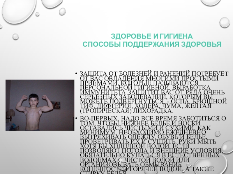 ПОТРЕБУЕТ ОТ ВАС ОВЛАДЕНИЯ МНОГИМИ ПРОСТЫМИ ПРИЕМАМИ, КОТОРЫЕ НАЗЫВАЮТСЯ ПЕРСОНАЛЬНОЙ ГИГИЕНОЙ. ВЫРАБОТКА ИММУНИТЕТА ЗАЩИТИТ ВАС ОТ РЯДА ОЧЕНЬ СЕРЬЕЗНЫХ ЗАБОЛЕВАНИЙ, КОТОРЫМ ВЫ МОЖЕТЕ ПОДВЕРГНУТЬСЯ, - ОСПА, БРЮШНОЙ ТИФ, ДИФТЕРИЯ, ХОЛЕРА, ЧУМА, ЖЕЛТАЯ (ТРОПИЧЕСКАЯ) ЛИХОРАДКА.