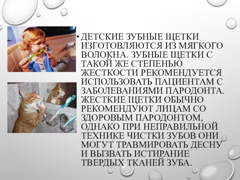 ЖЕ СТЕПЕНЬЮ ЖЕСТКОСТИ РЕКОМЕНДУЕТСЯ ИСПОЛЬЗОВАТЬ ПАЦИЕНТАМ С ЗАБОЛЕВАНИЯМИ ПАРОДОНТА. ЖЕСТКИЕ ЩЕТКИ ОБЫЧНО РЕКОМЕНДУЮТ ЛИЦАМ СО ЗДОРОВЫМ ПАРОДОНТОМ, ОДНАКО ПРИ НЕПРАВИЛЬНОЙ ТЕХНИКЕ ЧИСТКИ ЗУБОВ ОНИ МОГУТ ТРАВМИРОВАТЬ ДЕСНУ И ВЫЗВАТЬ ИСТИРАНИЕ ТВЕРДЫХ ТКАНЕЙ ЗУБА.