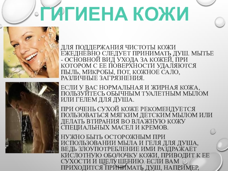 НУЖНО БЫТЬ ОСТОРОЖНЫМ ПРИ ИСПОЛЬЗОВАНИИ МЫЛА И ГЕЛЯ ДЛЯ ДУША, ВЕДЬ ЗЛОУПОТРЕБЛЕНИЕ ИМИ РАЗДРАЖАЕТ КИСЛОТНУЮ ОБОЛОЧКУ КОЖИ, ПРИВОДИТ К ЕЕ СУХОСТИ И ШЕЛУШЕНИЮ. ЕСЛИ ВАМ ПРИХОДИТСЯ ПРИНИМАТЬ ДУШ, НАПРИМЕР, ПОСЛЕ СПОРТИВНЫХ ТРЕНИРОВОК, ТО ПОЛЬЗУЙТЕСЬ МОЮЩИМИ СРЕДСТВАМИ ЛИШЬ, ЕСЛИ СИЛЬНО ВСПОТЕЛИ, В ЭТОМ СЛУЧАЕ КИСЛОТНАЯ ОБОЛОЧКА МЕНЬШЕ РАЗДРАЖАЕТСЯ.