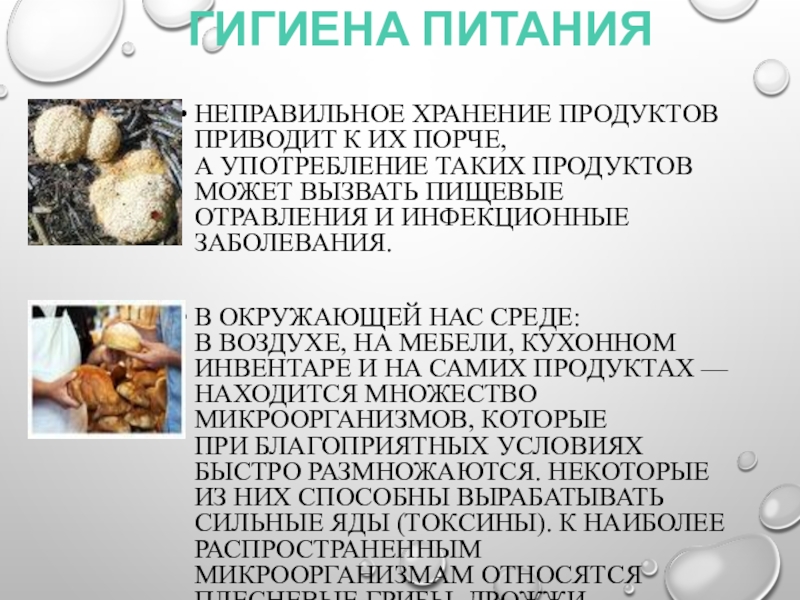 В ОКРУЖАЮЩЕЙ НАС СРЕДЕ: В ВОЗДУХЕ, НА МЕБЕЛИ, КУХОННОМ ИНВЕНТАРЕ И НА САМИХ ПРОДУКТАХ — НАХОДИТСЯ МНОЖЕСТВО МИКРООРГАНИЗМОВ, КОТОРЫЕ ПРИ БЛАГОПРИЯТНЫХ УСЛОВИЯХ БЫСТРО РАЗМНОЖАЮТСЯ. НЕКОТОРЫЕ ИЗ НИХ СПОСОБНЫ ВЫРАБАТЫВАТЬ СИЛЬНЫЕ ЯДЫ (ТОКСИНЫ). К НАИБОЛЕЕ РАСПРОСТРАНЕННЫМ МИКРООРГАНИЗМАМ ОТНОСЯТСЯ ПЛЕСНЕВЫЕ ГРИБЫ, ДРОЖЖИ И БАКТЕРИИ.