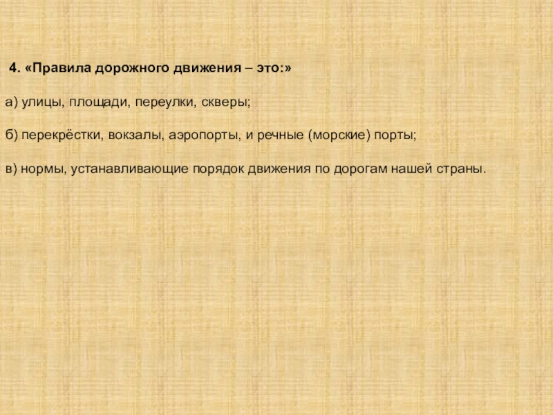 Слайд 6 4. «Правила дорожного движения – это:»