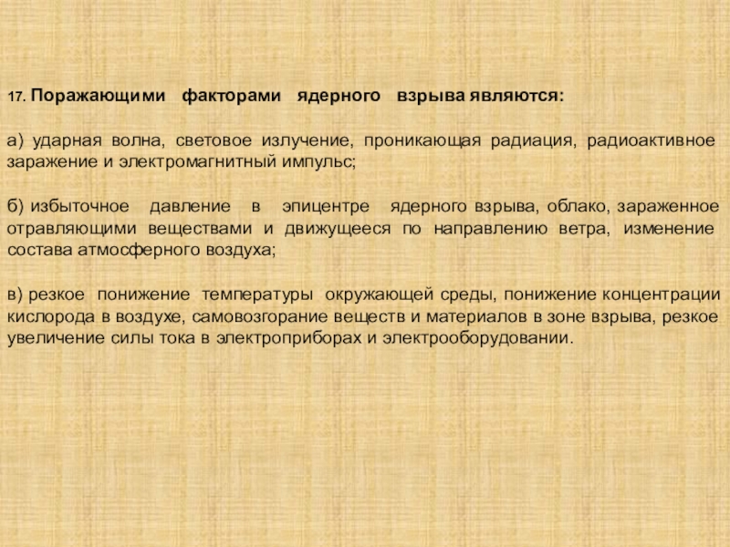 Слайд 1917. Поражающими факторами ядерного взрыва являются:
