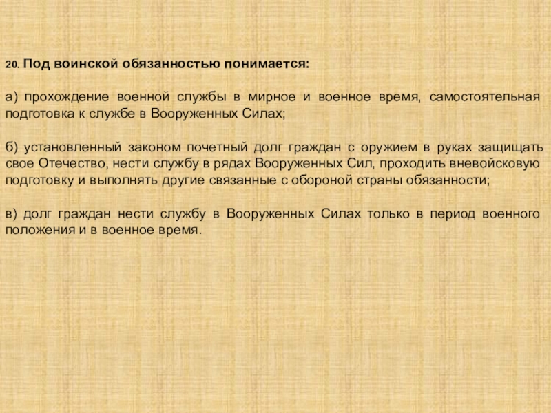 Слайд 2220. Под воинской обязанностью понимается:
