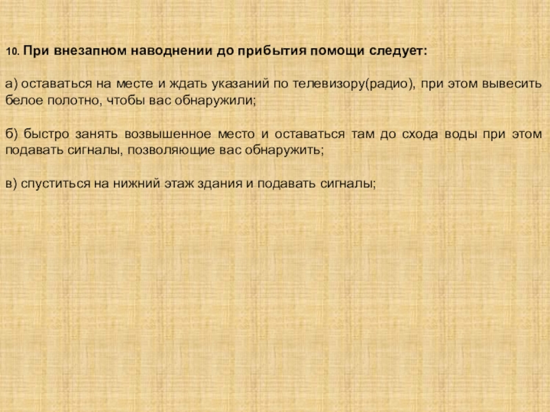 Слайд 1210. При внезапном наводнении до прибытия помощи следует: