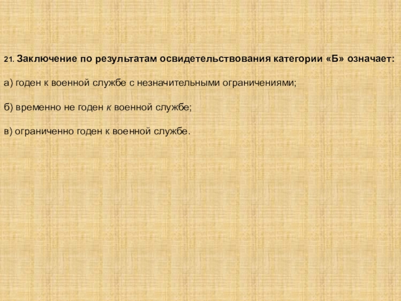 Слайд 2321. Заключение по результатам освидетельствования категории «Б» означает: