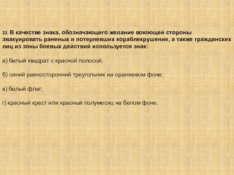 Слайд 2422. В качестве знака, обозначающего желание воюющей стороны эвакуировать раненых и