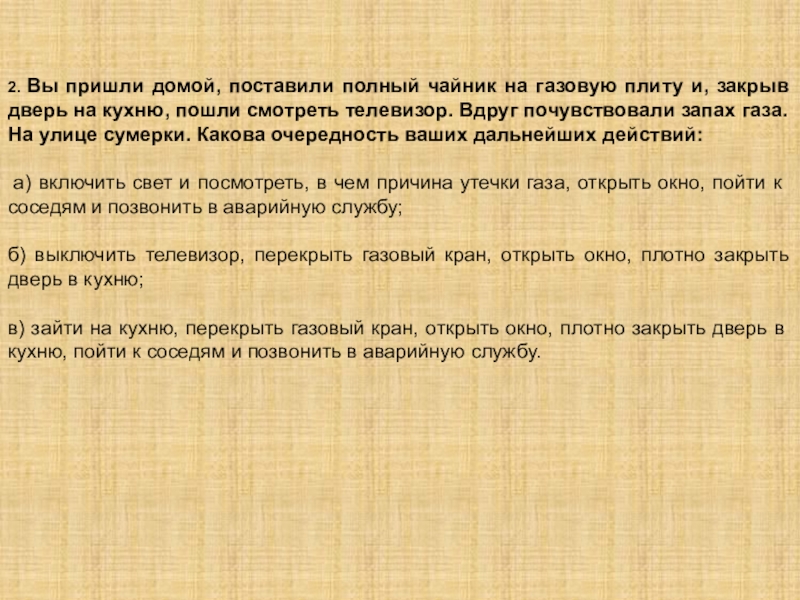 закрыв дверь на кухню, пошли смотреть телевизор. Вдруг почувствовали запах газа. На улице сумерки. Какова очередность ваших дальнейших действий: