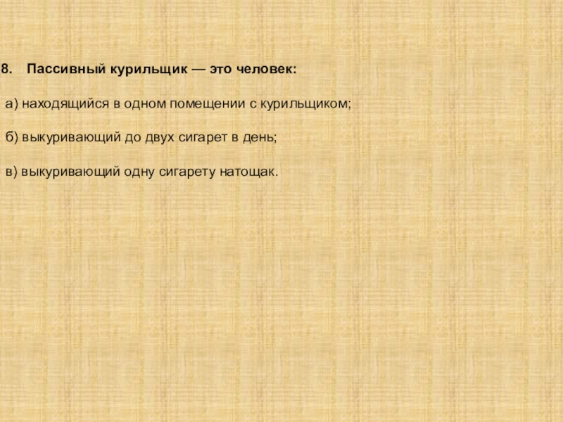 Слайд 20Пассивный курильщик — это человек: