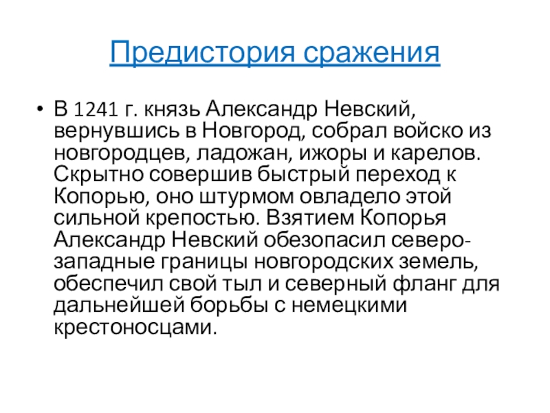 войско из новгородцев, ладожан, ижоры и карелов. Скрытно совершив быстрый переход к Копорью, оно штурмом овладело этой сильной крепостью. Взятием Копорья Александр Невский обезопасил северо-западные границы новгородских земель, обеспечил свой тыл и северный фланг для дальнейшей борьбы с немецкими крестоносцами.