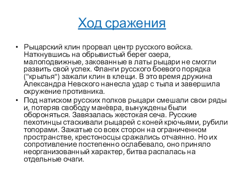 озера, малоподвижные, закованные в латы рыцари не смогли развить свой успех. Фланги русского боевого порядка ("крылья") зажали клин в клещи. В это время дружина Александра Невского нанесла удар с тыла и завершила окружение противника.